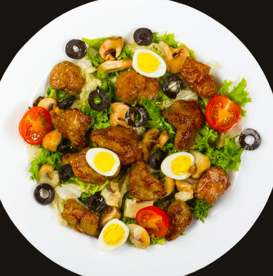 Grilovaný sýr Halloumi na směsi čerstvého salátu s rajčaty, okurkou a medovo‑hořčičným dresinkem.